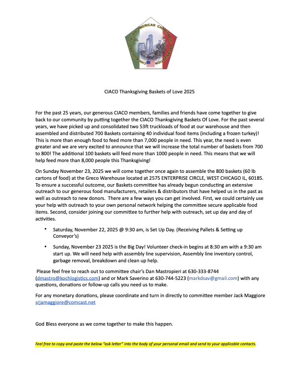 Every November, CIACO members, their families and friends gather at the ReNu in Glendale Heights to assemble 600 crates, containing approximately 50 pounds of food, including a turkey. Funds and food items are donated by personal and corporate sponsors. Local churches, shelters and other charities reserve crates they require to be delivered to families in need.